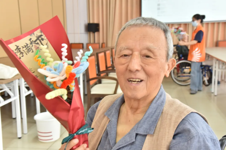 不一會兒,美麗的手工花束就綻放在了長者們的手中,長者們的心情也如同花朵一樣燦爛。